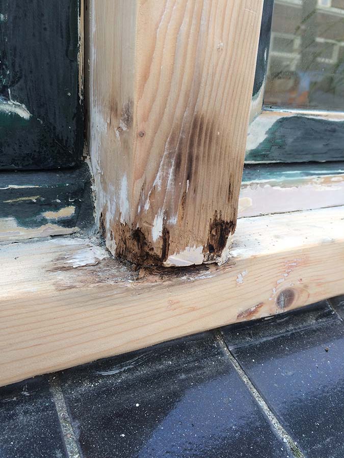 Er zijn diverse schimmels die houtrot veroorzaken: witte rot, bruine rot (of kubieke rot) en blauwschimmeldraden. Voor het verwijderen van de schimmel en het vocht is het in sommige gevallen mogelijk om het aangetaste stuk uit te frezen. Maar soms moeten wij een dorpel of stijl vervangen en is het economischer om een compleet raam of kozijn te vervangen.